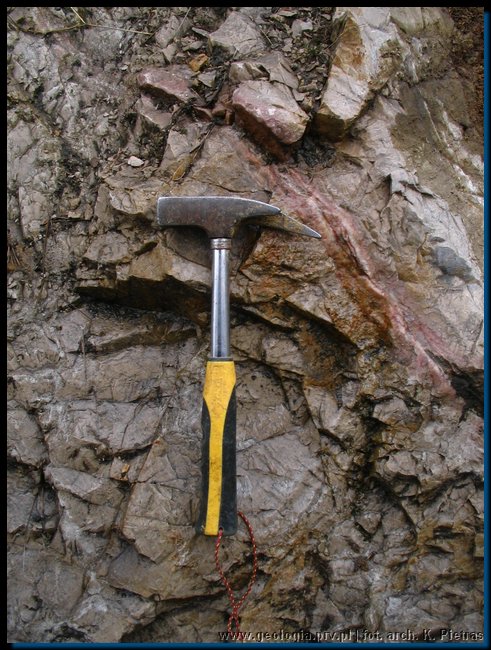 Wyżyna Krakowska Czerna Środkowa- dolnokarboński wapień przecięty żyłą czerwono-białego kalcytu (skarpa drogi w okolicy skrzyżowania koło Skałki Prawobrzeżnej) fot. K. Pietras 2005